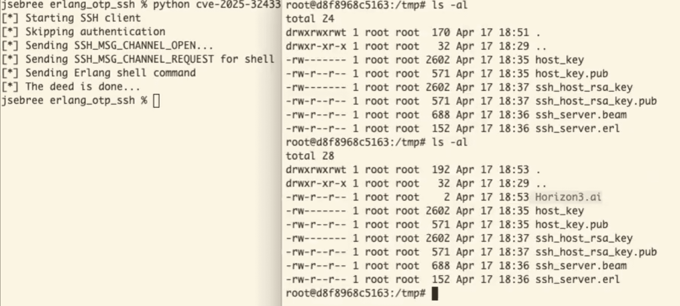 この Horizon3 チームは、「CVE-2025-32433 を再現し、簡単な PoC エクスプロイトを作成した。驚くほど簡単である。近いうちに、オープンな PoC が公開されても驚かない。この脆弱性を問題視するなら、速やかに行動を起こすべきだ」と X に投稿していた。
