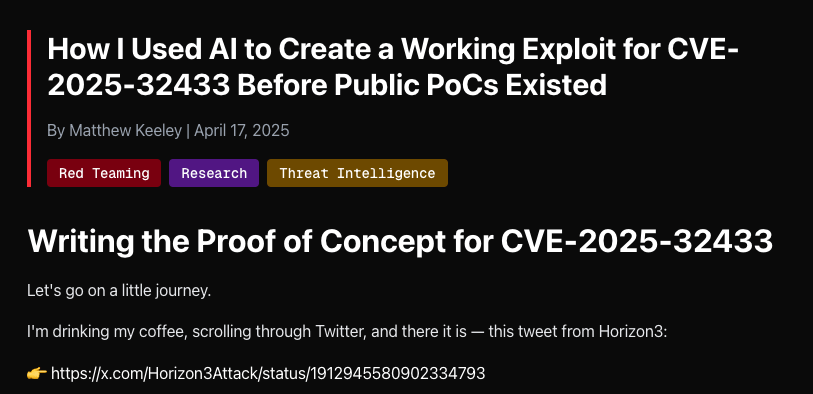 2025/04/23 SecurityExpress — エクスプロイト開発の自動化は、もはや遠い未来の話ではなく、現実の世界のものである。適切なプロンプトとオープンソース・データへのアクセスがあれば、人工知能は脆弱性に関する説明を、わずか数時間で実用的なエクスプロイトに変換できる。それを実証したのは ProDefense のエキスパート Matthew Keeley であり、Erlang SSH ライブラリの深刻な脆弱性 CVE-2025-32433 のエクスプロイトを、僅か一晩で作成することに成功したのだ。