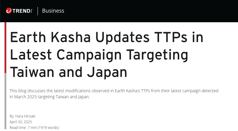 この研究者は、「依然として Earth Kasha は、活発かつ高度な持続性の脅威であり、2025年3月に検知した最新のキャンペーンでは、台湾と日本の政府機関や公共機関が標的にされていた」と述べている。