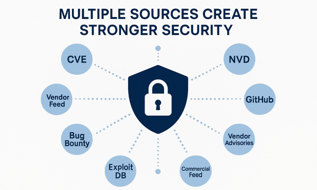 効果的な脆弱性インテリジェンスにとって不可欠なものは、複数のデータソースの連携である。単一のデータベースだけでは、現代の脅威環境を完全には網羅できない。セキュリティ・チームが構築すべき戦略は、従来の CVE データ/商用インテリジェンス/ベンダー・アドバイザリ/脅威インテリジェンス・フィードを組み合わせるものになる。