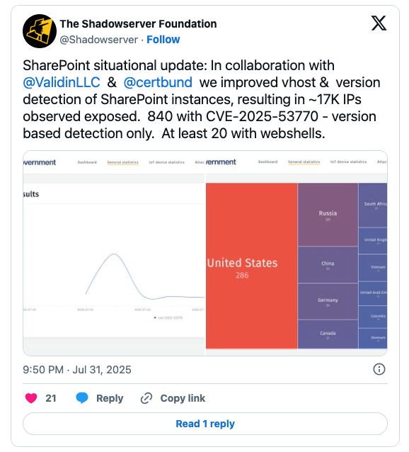 2025/07/31 CyberSecurityNews — 膨大な数の Microsoft SharePoint サーバが、インターネット・ベースの攻撃に対して深刻な状況にあることが、Shadowserver Foundation の新たな調査結果により判明した。具体的には、17,000 台以上のサーバが攻撃にさらされており、そのうちの 840 台が深刻なゼロデイ脆弱性 CVE-2025-53770 (CVSS:9.8) の影響を受けている。