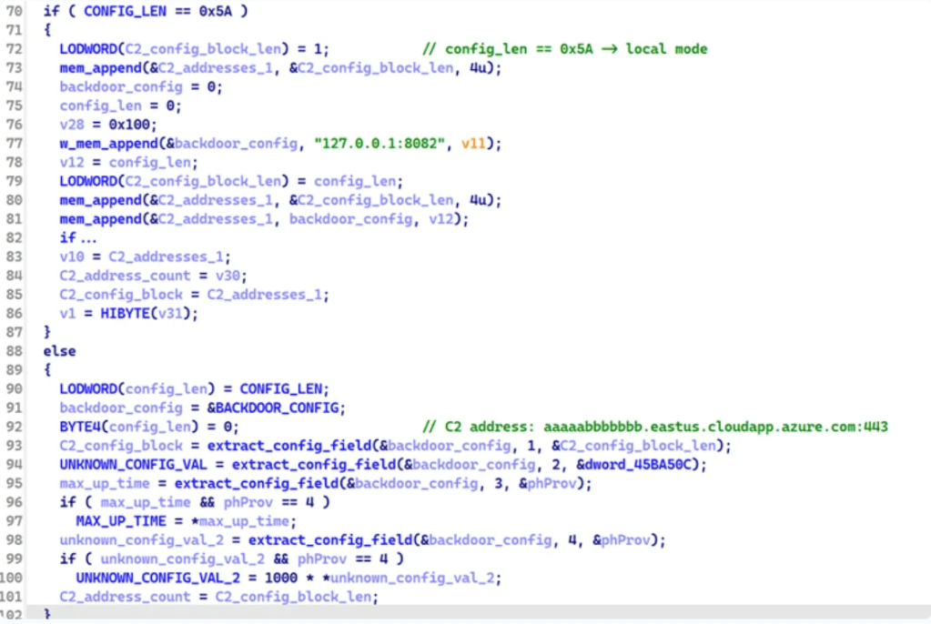 続いて、その時点では無効化されている C2 ドメイン (aaaaabbbbbbb.eastus.cloudapp.azure.com:443) を取り込むコンフィグ・データは、オペレーション管理のため解析され、テスト時にはローカル・ループバックにフォールバックされる。
