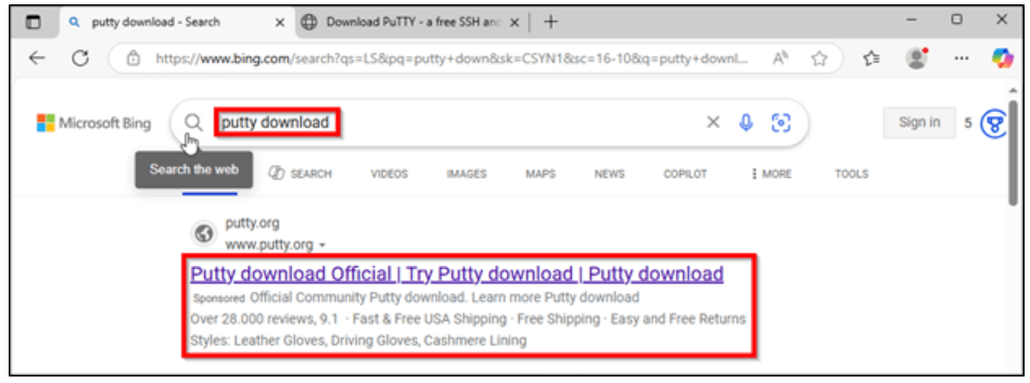 | Domain | puttysystems[.]com | Malvertising landing used to impersonate PuTTY download. |