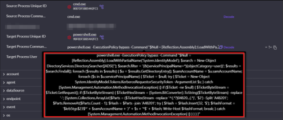 記録されている最新のアクションは、Kerberoasting を実行するインライン PowerShell スクリプトだった。このスクリプトは、SPN を持つアカウントの TGS チケットを要求し、AES が適用されていない場合には、弱い RC4-HMAC を活用し、メモリ内でチケット・バイトを抽出して、Hashcat 対応の $krb5tgs$ マテリアル (モード 13100) を出力するものだ。