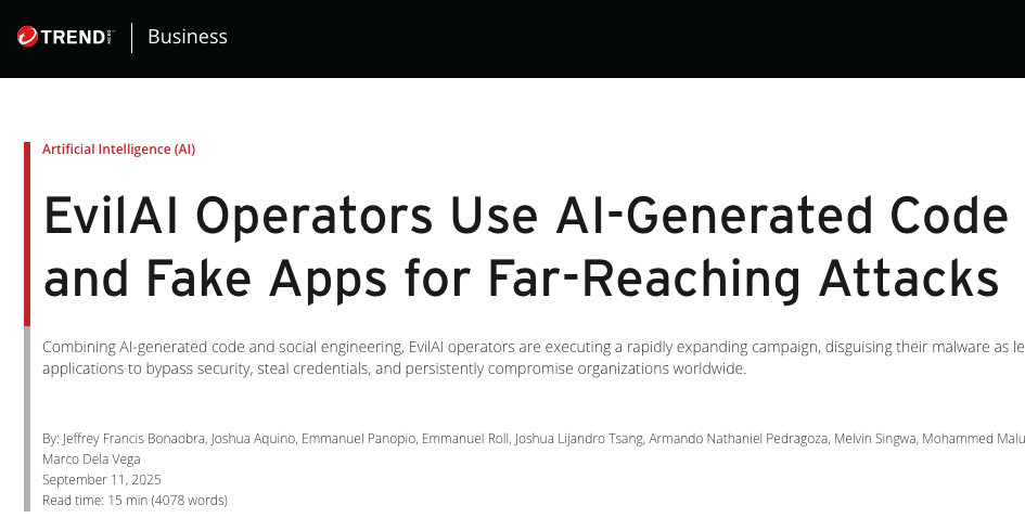 2025/09/12 gbhackers — Trend Research が追跡する新たなマルウェア・ファミリー EvilAI が、この数週間にわたり、正規の AI 駆動型ユーティリティを装いながら活動している。これらのトロイの木馬は、プロフェッショナルなユーザー・インターフェイスや有効なコード署名に加えて実際の機能を備えており、企業/個人のセキュリティ対策を回避していく。