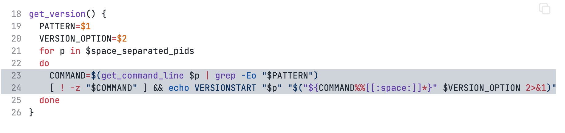 NVISO によると、この脆弱性は get_version() 関数に起因するという。この関数はリスニング・ソケットを持つ各プロセスへ向けた、正規表現 (regex) パターンを入力として受け取り、対象プロセスに関連付けられたバイナリ名とパターンの一致を判定し、一致すればサービスのバージョン・コマンドを呼び出す仕組みを持つという。