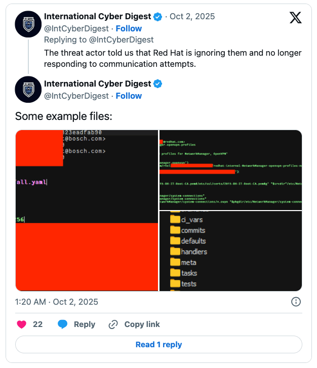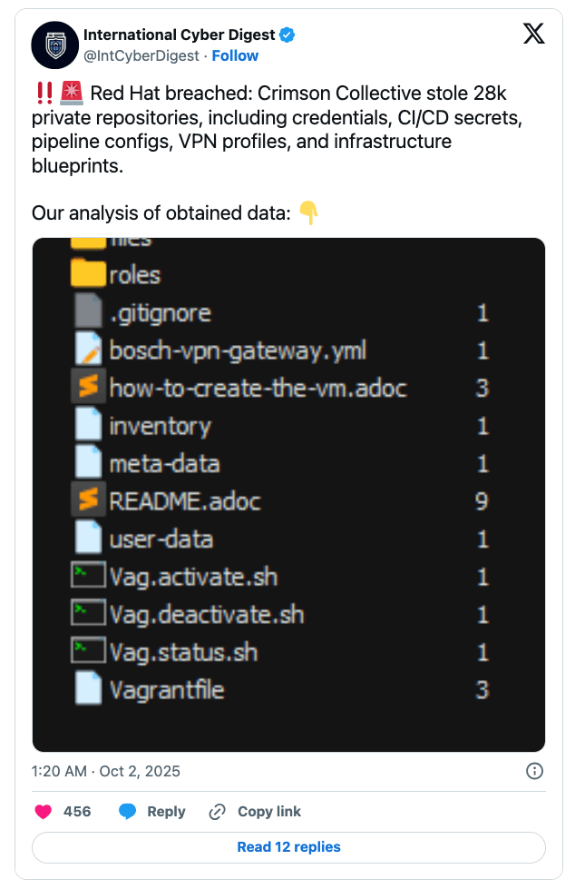 2025/10/02 CyberSecurityNews — Crimson Collective として知られる恐喝グループの犯行声明は、Red Hat の GitHub 非公開リポジトリ 28,000 件に侵入し、約 570GB の圧縮データを盗み出したというものだ。この窃取されたデータには、不正に抽出されたソースコードや機密情報などが含まれ、これまでの最大級の侵害だとされる。