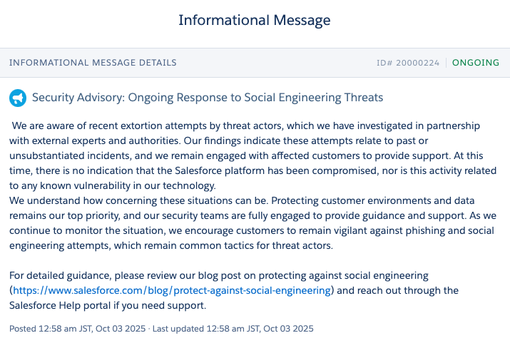 ShinyHunters がデータ漏洩サイトを開設した後に、Salesforce が声明を公表している。同社は、「脅威アクターによる最近の恐喝行為を認識しており、外部の専門家や当局と連携して調査を行っている。調査結果によると、これらの行為は過去のインシデントあるいは、根拠のないインシデントに関連していることが判明しており、影響を受けたユーザーへのサポート提供を継続していく。現時点では、Salesforce プラットフォームが侵害されたという兆候はなく、この活動は当社における既知の脆弱性とは関連していない」と述べている。