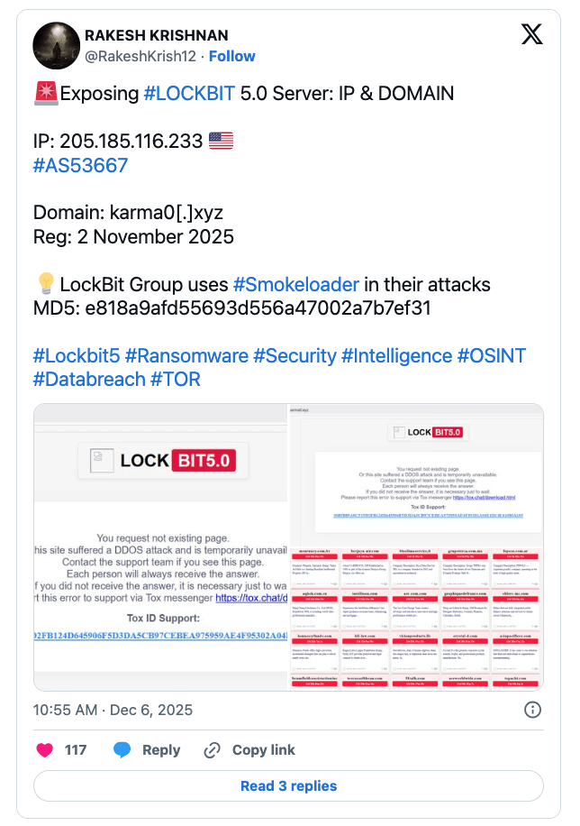 Krishnan は 2025年12月5日に X (旧 Twitter) で、この調査結果を初めて公表した。そこで明らかにされたのは、上記のドメインが登録されたばかりだが、LockBit 5.0 の活動に直接的に関連していることだった。