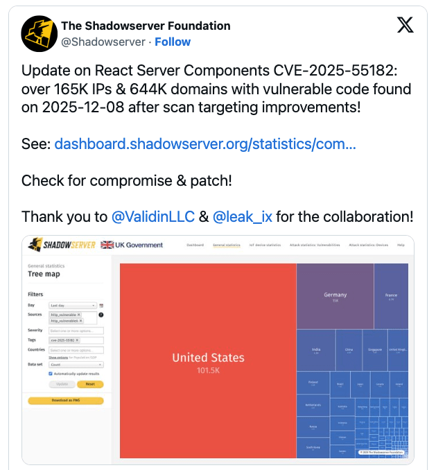 2025/12/11 gbhackers — Shadowserver Foundation が公表したのは、深刻な React2Shell 脆弱性 CVE-2025-55182 に関する情報の緊急アップデートである。そこで特定されたのは、依然として悪用される可能性のある大規模な攻撃対象領域である。この調査の一環として、2025年12月8日にスキャン・ベースの改善を実施した結果として、研究者たちが発見したのは、644,000 以上のドメインと 165,000 以上の固有 IP アドレスにおいて、依然として React Server Components の脆弱なインスタンスが稼働していることだった。