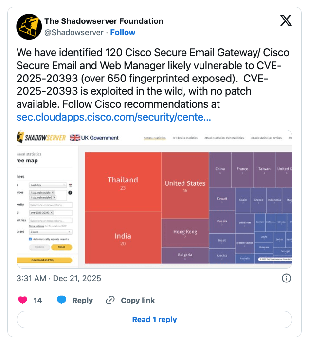 2025/12/21 CyberSecurityNews — セキュリティ研究者たちが確認したのは、少なくとも 120 台の Cisco Secure Email Gateway/Secure Email and Web Manager デバイスが、脅威アクターによる実環境での継続的かつ積極的な攻撃を受けていることだ。この攻撃には深刻なゼロデイ脆弱性 CVE-2025-20393 が悪用されており、現時点でパッチが提供されていないため、多くの組織が潜在的なセキュリティ侵害のリスクにさらされている。