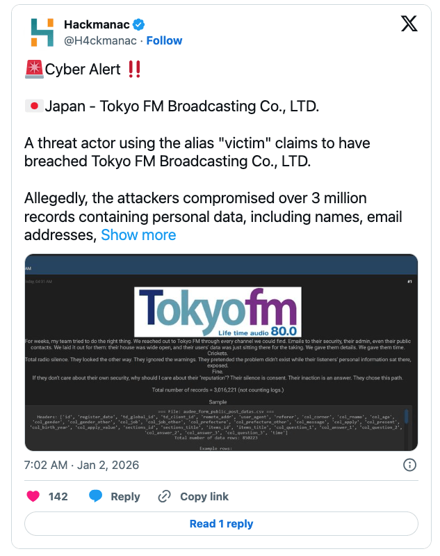 2026/01/02 gbhackers — 日本の主要 FM ラジオ放送局である Tokyo FM を標的とする、大規模なデータ侵害について、victim という偽名で活動する脅威アクターが犯行声明を出した。この 2026年1月1日に確認された侵入により、数百万人分の個人情報が漏洩した可能性があると報じられている。