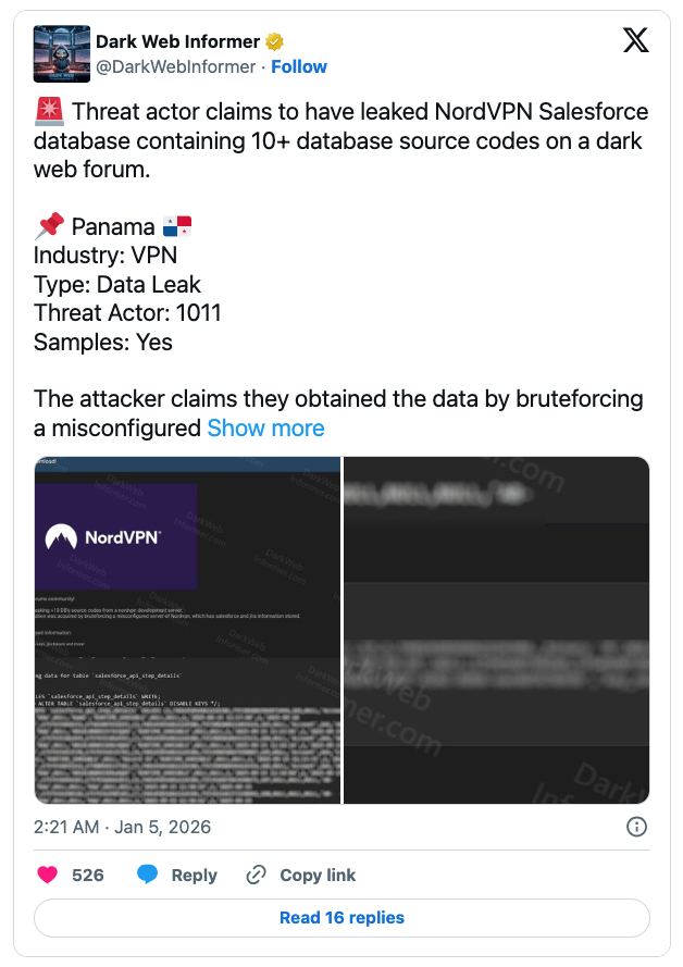 Threat Actor Allegedly Claim Leak of NordVPN Salesforce Database with Source Codes