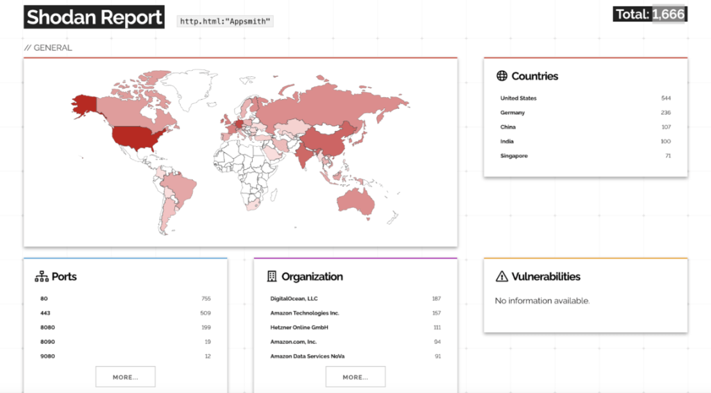 Resecurity が参照したインターネット・スキャン・データによると、1,666 件の Appsmith インスタンスが公開状態で稼働している。