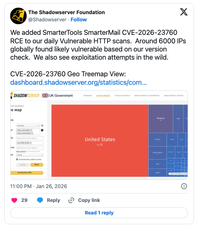 2026/01/27 CyberSecurityNews — インターネット上に公開されている 6,000 台以上の SmarterMail サーバが脆弱なバージョンを実行しており、アクティブなリモート・コード実行 (RCE) 攻撃のリスクにさらされていることが判明した。日次の HTTP 脆弱性スキャンを通じて、セキュリティ研究者たちが問題を特定しており、すでに実環境での悪用試行が観測されている。このインシデントは、エンタープライズ向けのメール運用環境として SmarterMail を利用する、世界中の組織に対して深刻な脅威となっている。