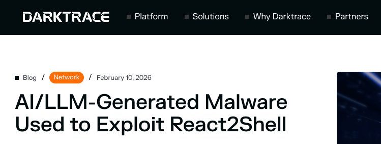 2026/02/11 SecurityBoulevard — Darktrace の CloudyPots ハニーポット・ネットワークで、先日に捕捉されたマルウェアサンプルは、完全に AI により生成されたものである。2ヶ月前に公開され、現在も脅威であり続ける React2Shell 脆弱性を悪用するために、このマルウェアは構築されている。システムへの初期侵入を達成したマルウェアは、その後に暗号通貨マイニングを実行する。この名称が与えられていないマルウェアは、Large Language Model (LLM) などの AI ツールを用いて、その大部分を作成するという。