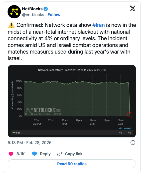 NetBlocks は、「現状におけるネットワーク・データが示すのは、#Iran がほぼ全面的なインターネット・ブラックアウトの最中にあることであり、イラン国内の接続性が通常水準の 4% にまで低下していることである。この事象は、米国とイスラエルの軍事作戦と同時期に発生しており、昨年のイスラエルとの紛争時に用いられた措置と一致する」と、X に投稿している。