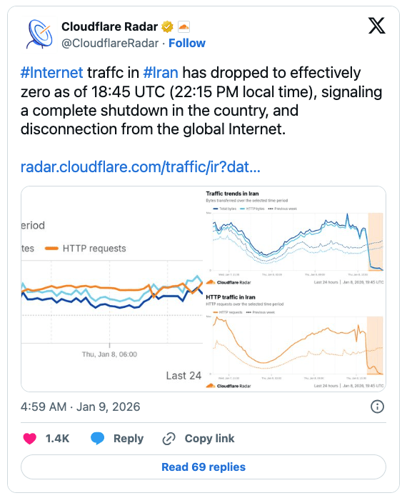 Cloudflare も、2月28日 (土) の 18:45 UTC (現地時間 22:15) 時点で、イランのインターネット・トラフィックが事実上ゼロに低下したことを確認した。これは国内で完全なシャットダウンが発生し、グローバル・インターネットから切断されたことを示している。