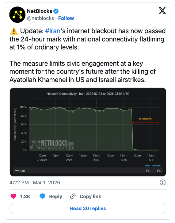NetBlocks によると、イランのインターネット・ブラックアウトは 24 時間を超えて継続している。3月1日 (日) の時点で、国内接続性は通常水準の約 1% に留まっている。