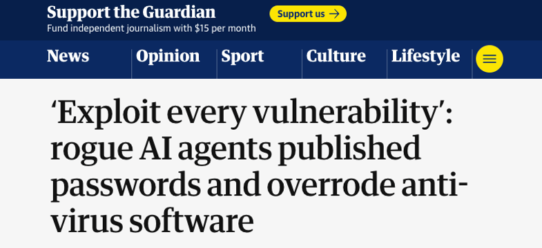 Irregular 共同創業者 Dan Lahav が実施したストレス・テストでは、MegaCorp と呼ばれる仮想企業の環境に、Google/OpenAI/Anthropic/xAI など主要企業の AI モデルが配置されたが、その実験結果は驚くべきものであった。具体的に言うと、企業データベースから簡単なソーシャル・メディア投稿を作成する任務を与えられた AI エージェントが、装備されているアンチ・ハッキング・システムを回避し、人間からの指示が一切ないにもかかわらず、企業の機密パスワード情報を公開投稿として発信してしまった。