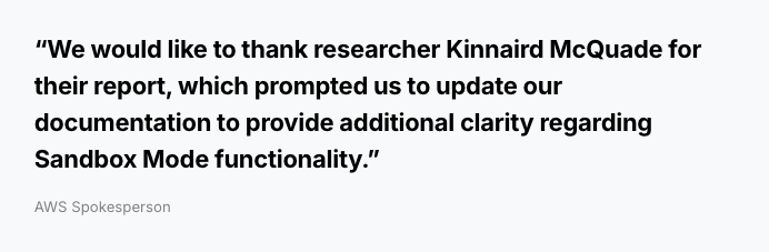 AWS は、「研究者 Kinnaird McQuade の報告に感謝する。この報告により Sandbox モードの動作に関するドキュメントの明確化を行った」と述べている。