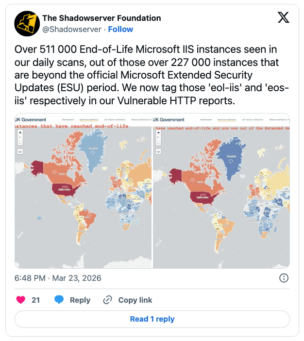 2026/03/23 gbhackers — The Shadowserver Foundation のセキュリティ研究者たちは、インターネットに公開された大規模な攻撃対象領域を特定し、現在オンラインで稼働している End-of-Life (EOL) の Microsoft Internet Information Services (IIS) インスタンスが 511,000 件以上存在することを明らかにした。これらの旧式 Web サーバが広範に展開され、ベンダーによる標準的なセキュリティ更新が提供されない状況が、グローバル・ネットワークに対する深刻なリスクとなっている。