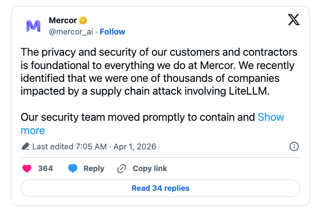 訳者後書:広く利用されるオープンソース・ソフトウェア (OSS) を狙うサプライチェーン攻撃が、今回のインシデントの原因となっています。具体的には、LiteLLM というライブラリの公開用認証情報が盗まれ、悪意のバックドアが埋め込まれたバージョンが配布され、Mercor AI で問題が発生しました。この記事には、特定の CVE 番号は記載されていませんが、信頼しているツールが上流で改竄されると、それを利用する多くの企業が、予期せぬ被害を受けてしまう可能性があります。よろしければ、カテゴリー SupplyChain も、ご参照ください。