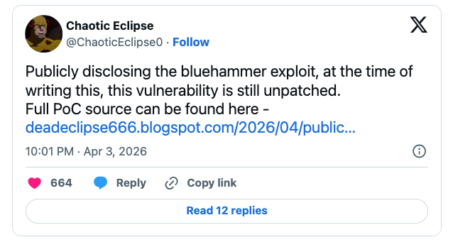 2026/04/07 CyberSecurityNews — Windows 環境に存在する、ゼロデイ・ローカル権限昇格 (LPE) に対する、エクスプロイト BlueHammer と完全な PoC ソースコードが、GitHub 上で公開されている。それらは、Chaotic Eclipse (@ChaoticEclipse0) というエイリアスで活動するセキュリティ研究者により提供されたものであり、実際に機能することが、脆弱性研究者 Will Dormann により確認されている。彼が指摘するのは、Microsoft のセキュリティ対応プロセスが要因となり、適切な調整が行われない状態で、この脆弱性が公開されたことだ。