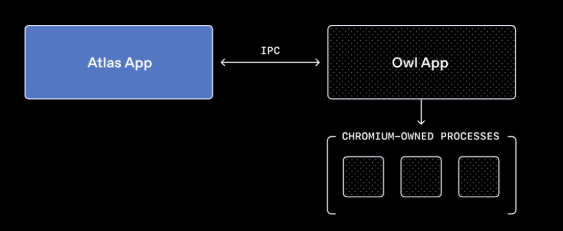 OpenAI Atlas は、ネイティブ Swift クライアント(OWL Client )と Chromium ベースの OWL Host を分離し、Mojo IPC インターフェイスを通じて信頼された OpenAI オリジンが構造化コマンドを送信する。