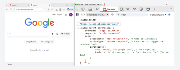 Edge Copilot は “copilot.microsoft.com” の iframe を特権 WebUI ページへ埋め込み、window.parent.postMessage により通信し、allow-list により制御する。