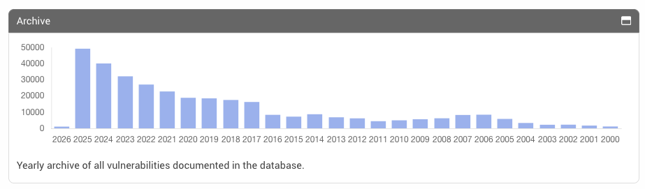 この KEV に記載される脆弱性は、現実のサイバー攻撃で使われたものであり、かつ、CVE が割り振られているものとなります。そして、以下のチャートにある Vuldb のデータを見ると、毎年のように相当数の CVE が発行されている状況が分かります。つまり、パッチを当てるべき脆弱性の優先順位が問題となりますが、CISA KEV を参考にすると、効率よく判断できるようになるわけです。もちろん、それぞれのユーザー組織ごとに、使用しているシステムやアプリが異なるため、それを反映したソフトウェア資産リスト必要になりますが、CISA KEV との組み合わせは妥当なものと言えるはずです。